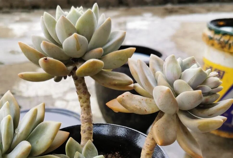 一、度夏中的叶耗现象。大多数景天科的多肉都有夏天休眠的习惯,主要是夏天温度较高,植株生长缓慢或是停止生长。外在表现上可能出现颜色略退,不再那么“水灵”,其新陈代谢效率降低,此时会出现所谓的叶耗现象。就会表现为底部叶子发软、发皱,甚至外部叶片逐渐干枯的现象。处理办法:如果之前植株生长正常,则查看植株是否有病害或是蚧壳虫之类的,另外看看有无气根;如果都没有不用太在意,主要保证避免强光暴晒,保持通风,并适当给水,宁干勿湿,以保证干爽为主。当秋天来临温度温和,植株开始逐步恢复生长,随着恢复浇水,发软发皱的叶片忽逐步恢复,也可能随着新叶生长老叶逐渐干枯掉落。这属于正常的现象,不必太在意。