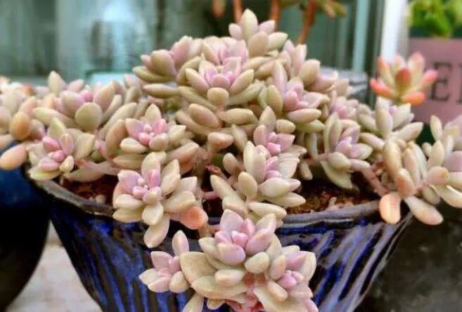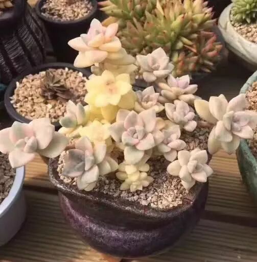 除此之外,秋丽多肉的叶子还有变色的特点,最初的时候,只是一种灰绿色,当接收阳光过多之后,就会发生奇妙的变化,由灰绿色变成粉红色,橙红色,以及紫红色,看上去五彩斑斓,十分的漂亮。