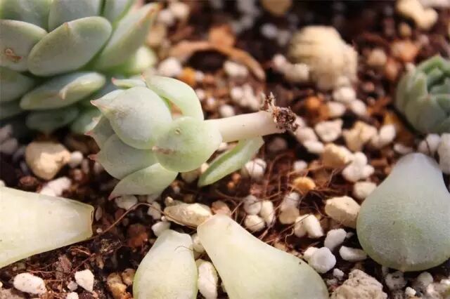 叶子一碰就掉,有时候就是多肉黑腐的征兆,这个时候要把黑腐的叶片扔掉,一般来说黑腐的叶片再叶插也基本上没戏。然后看看它的杆子和根系有没有黑掉,如果发现晚了,黑腐真的是没救了。