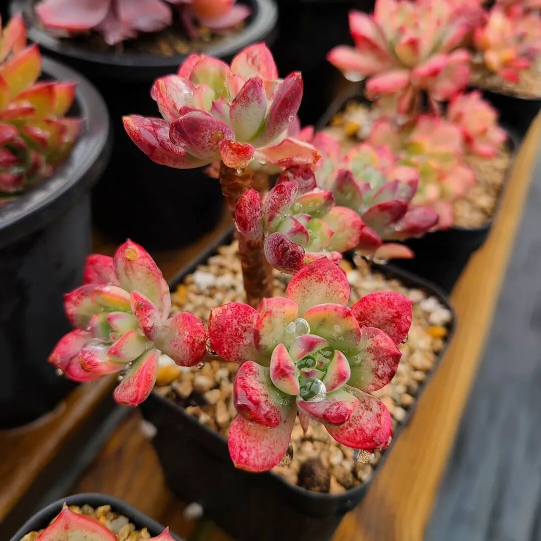 景天科这类细分每个属对水分的需求又有所不同,不过大家只需要了解一点就好:植物越大,所需的水分越多,植物越小需要的水分就少。而如果想控型,就只让它们长到固定大小,也可以通过减少浇水来实现。