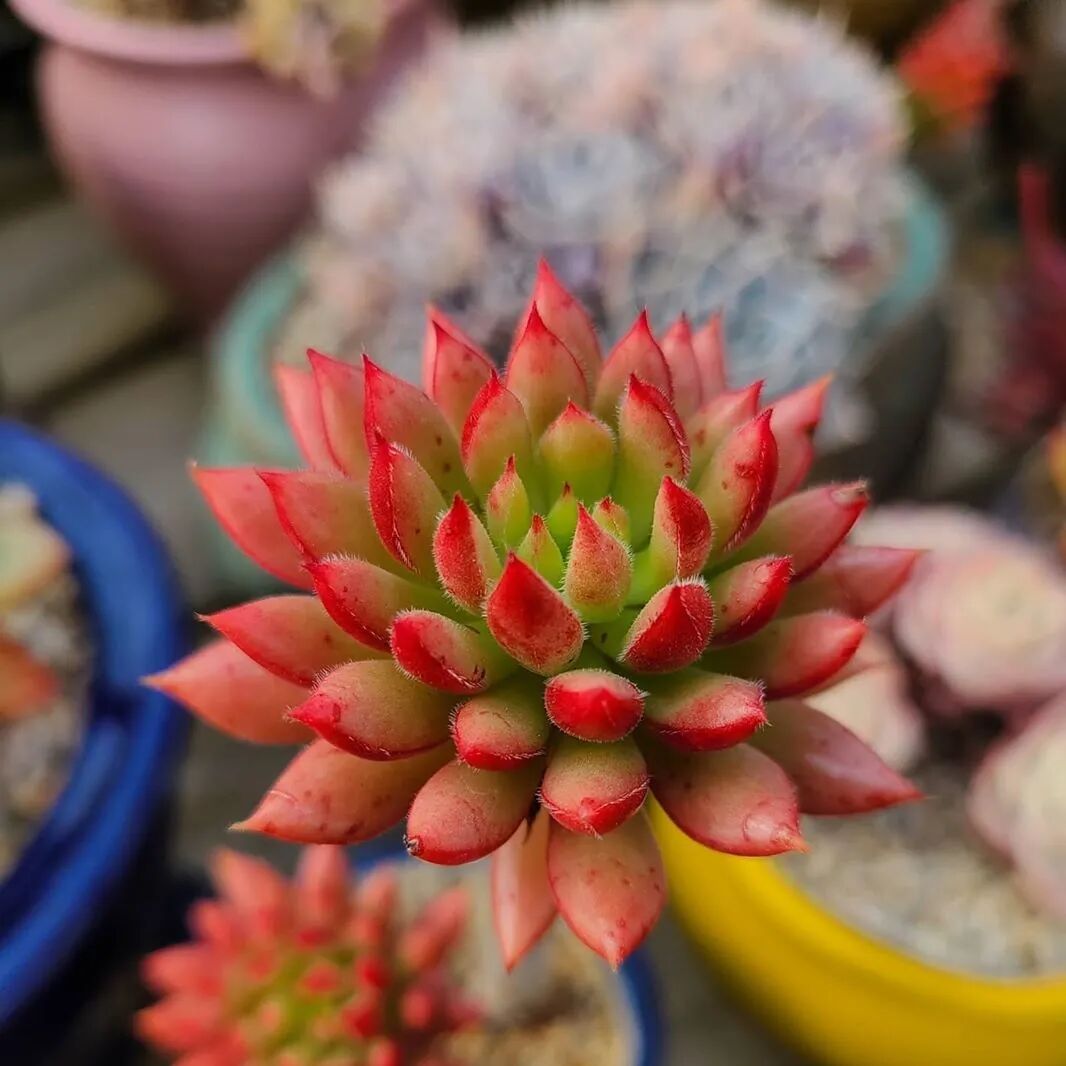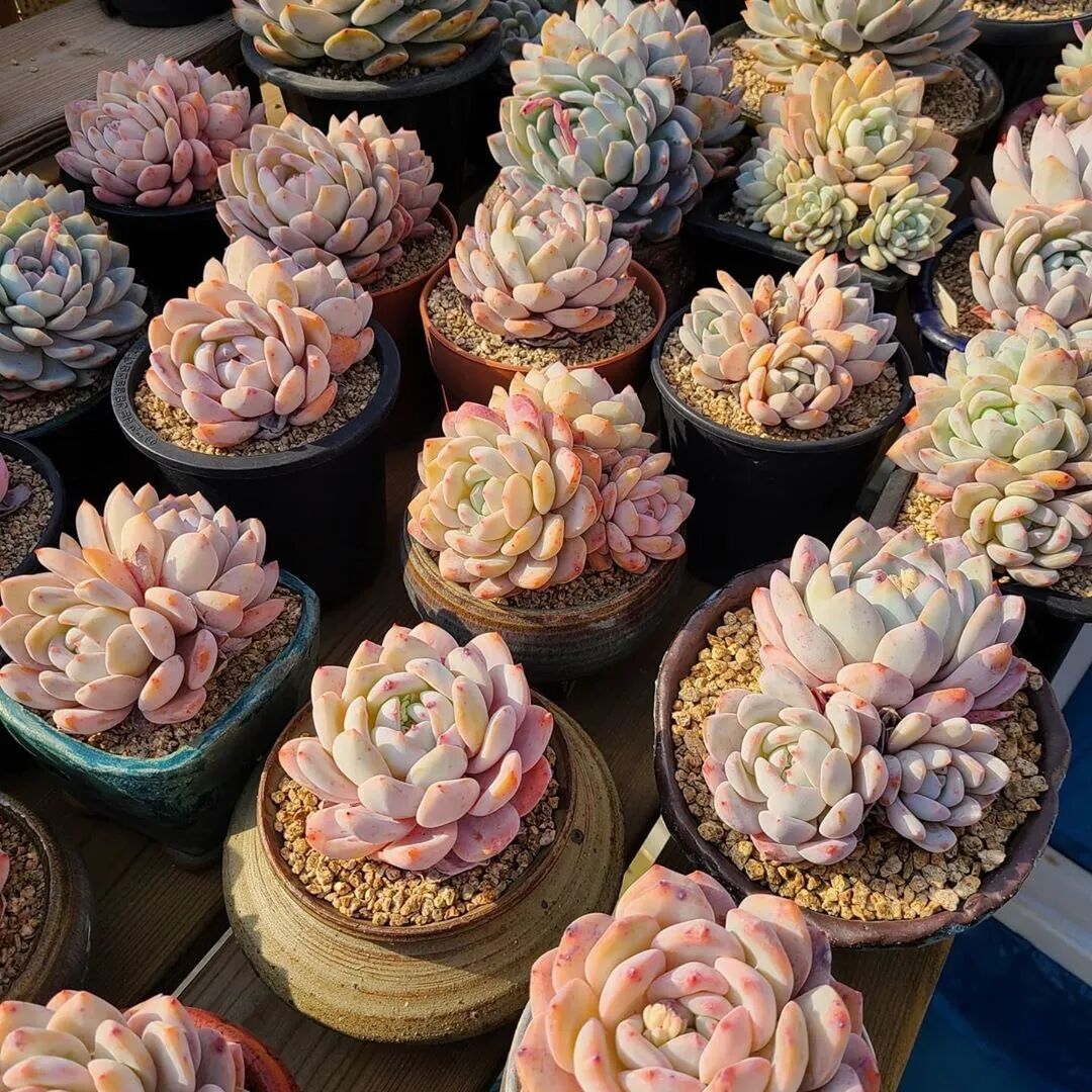 还有一些特别的组合盆栽,这类是最不怕水的啦,植物种类多,对水分的需求也更高,通风环境良好的情况下,可以随便噗噗噗的灌水~ 当然,一个月浇水一次也一点问题没有,并且颜色会更美。偶尔死掉一颗两颗,空出来的空间也会迅速被其他品种长满。