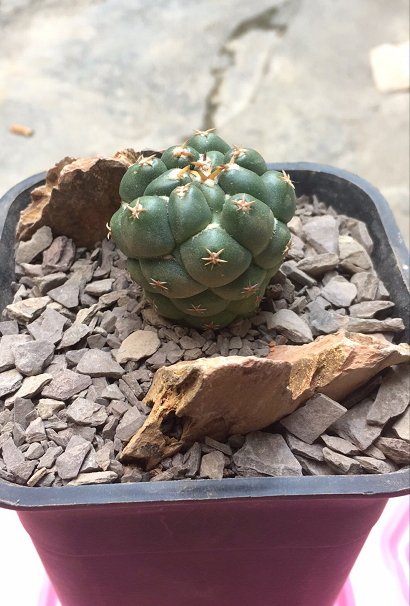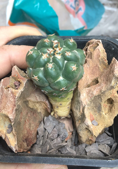 服盆方法:我觉得肉锥最好的发根时间是3月、9月和10月,所以除了这个两个季节我不买肉锥。如果是植物带老皮,而且木质化根又比较长,我会把老皮去掉,将木质化根修的很短,留一点主根。如果是小苗的话基本把根弄干净就种上了,不怎么修根。上盆后就浇水,等服盆了再进行铺面。(肉锥安贞,图片由随风提供)