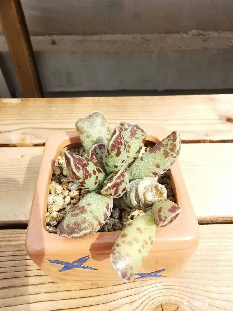 冬天:我的肉放的地方比较分散,主要是有阳光暖和的地方太少了。大部分集中在一个没有任何取暖设施的毛坯房里,冬天晚上基本在零上五度以内,白天有阳光温度会在十度左右吧,冬天我基本很少浇水,拉长浇水的周期,除非是叶子很皱,我才会溜边浇点,还要选择在温度很高的中午以及浇水后几天温度都比较高点的那天,浇的水也是温水,这样不容易伤根,但也有几盆冻死了。低温对多肉的上色也很重要,出来的颜色会让你惊喜的。还有一部分放在补光灯下面,每天有八小时的补光时间,屋子比较小,没有阳光全靠补光灯,我买的也是很便宜的那种,但最起码不能徒长,屋里通风不好,每次浇水我都会开风扇吹一天,定期浇点我前面说的调酸之后的大桶水,基本上秋天的颜色不会掉很多。安然过冬后进去到第一个逆袭期春天。