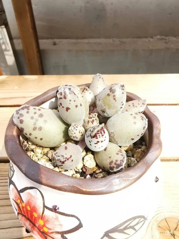 我个人属于比较懒的,不爱老浇水,主要是不方便,如果是太透气的盆,根系还没吸饱水,土壤里面的水份就蒸发了,(这里有过实验,之前买过同一批奶酪,一个种在纯粗陶里,一个是外面带釉的,不管是服盆期间还是生长期间,带釉的生长较好,最近一段时间断断续续一直下雨,两颗都格外的饱满。)在此不推荐内外两层都是釉层的瓷盆。